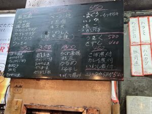 それはそうと、入ってすぐのカウンター席に腰掛けたんだが、運悪く品書き短冊をすべて見渡すのは困難なポジショニングであった。