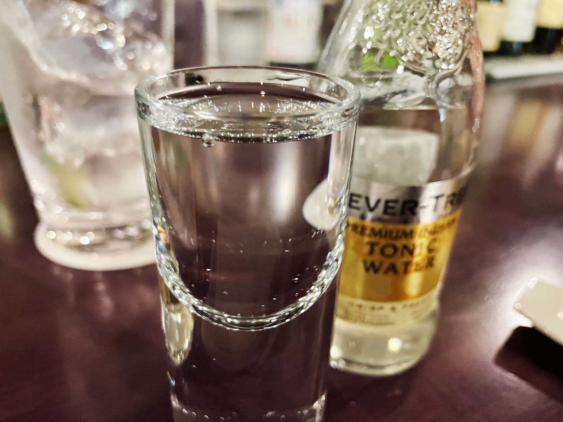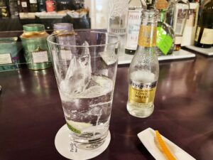 見たことのないトニックウォーター、背の高いグラスの5分目ぐらいまでしか使わないのが店のスタイルか。