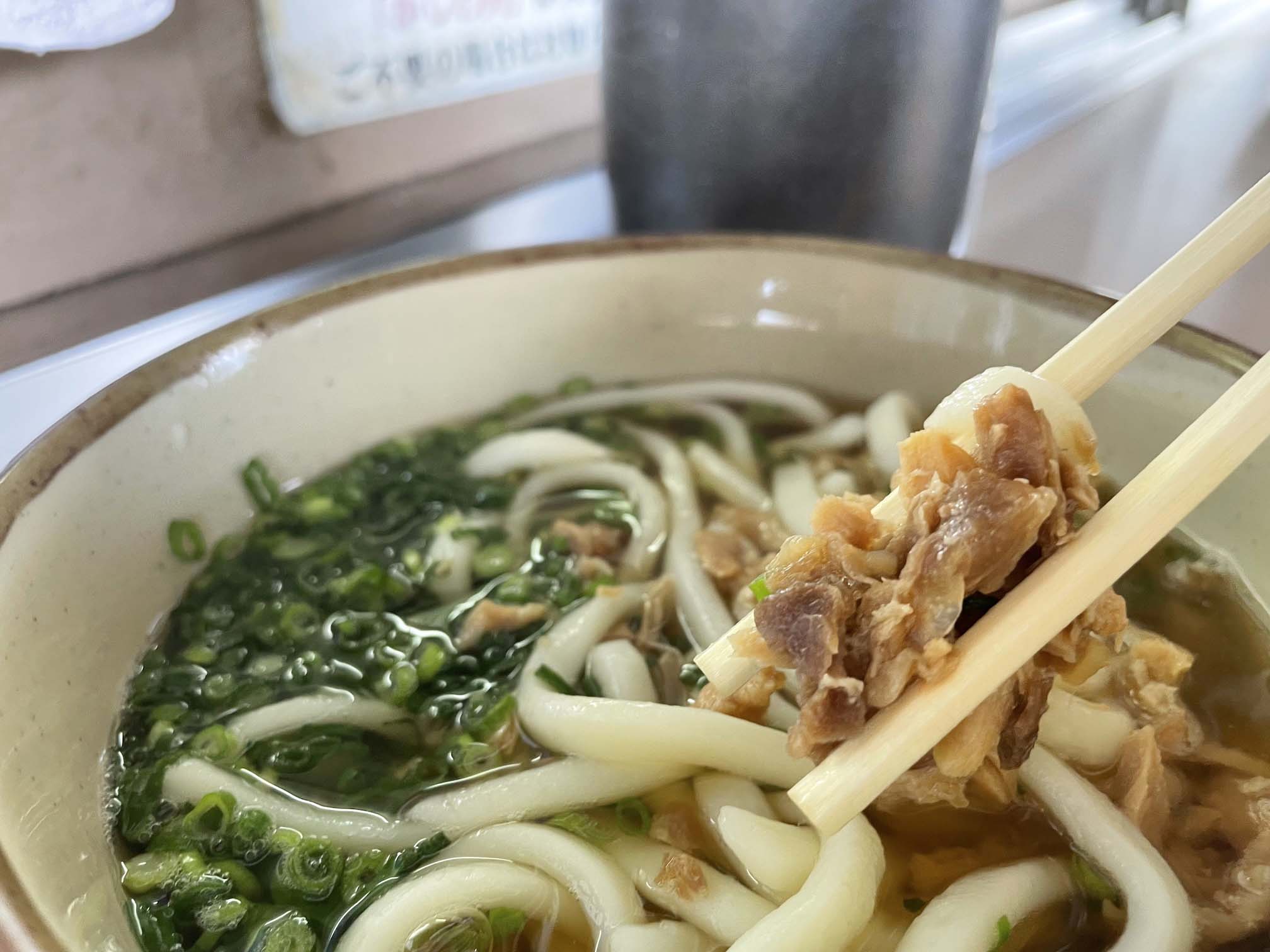かしわうどん500円、できたて熱々が迅速に提供された。