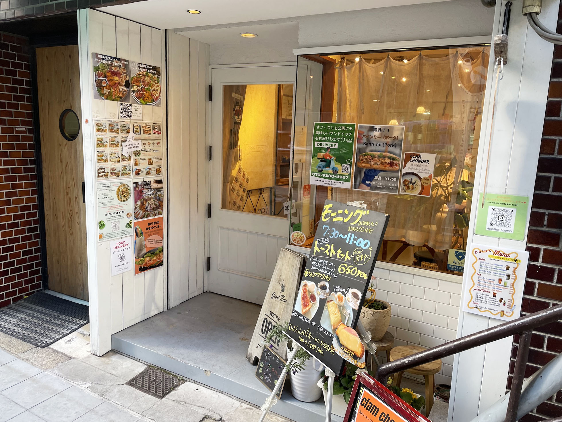 緑色のテントが目印、洒落た雰囲気のエントランス、店名は「GOOD TIME」。