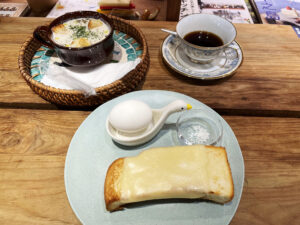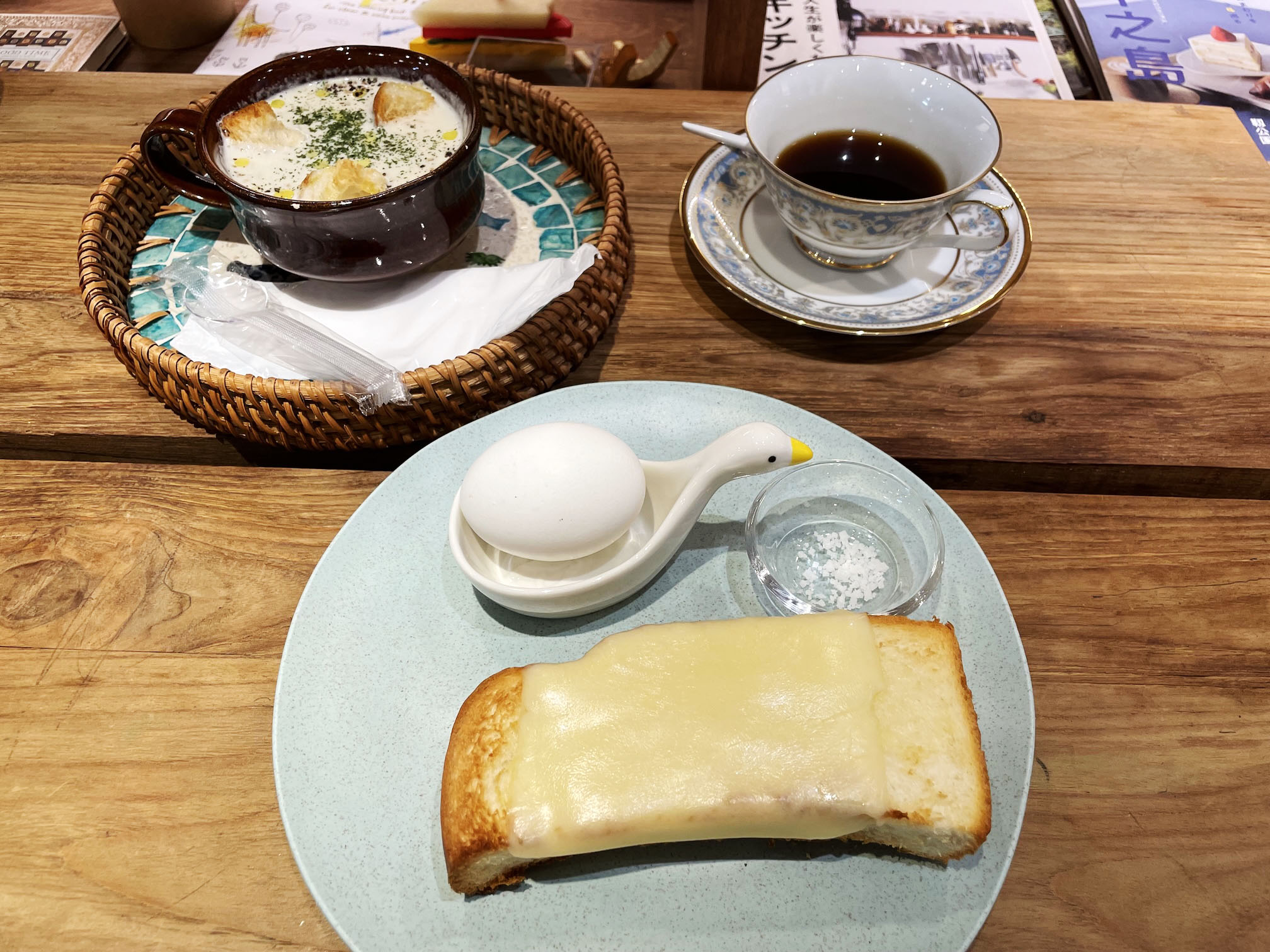 バター×チーズのトースト、飲みものはホットコーヒーで、クラムチャウダー単品を追加で、とお願いした。